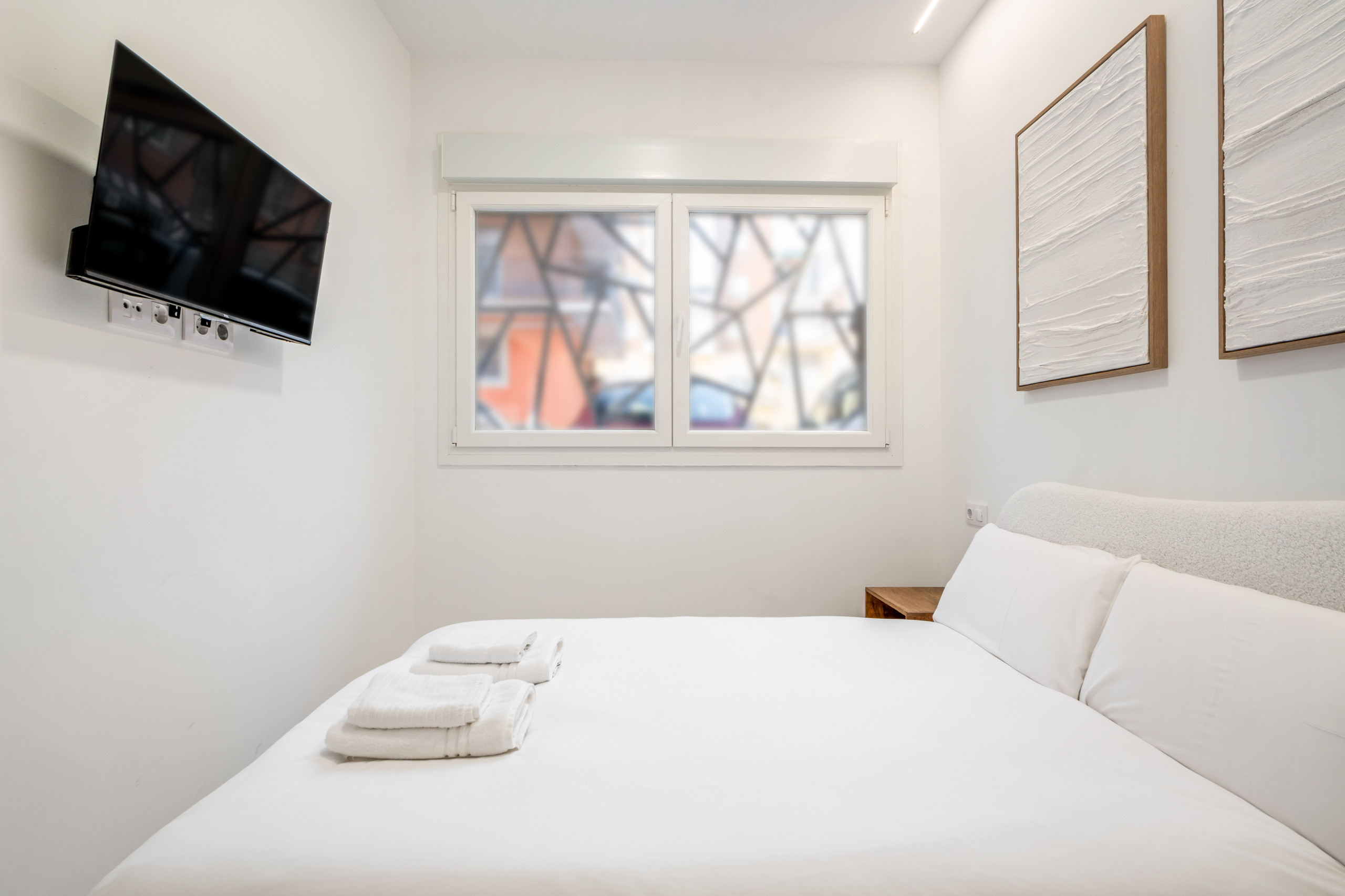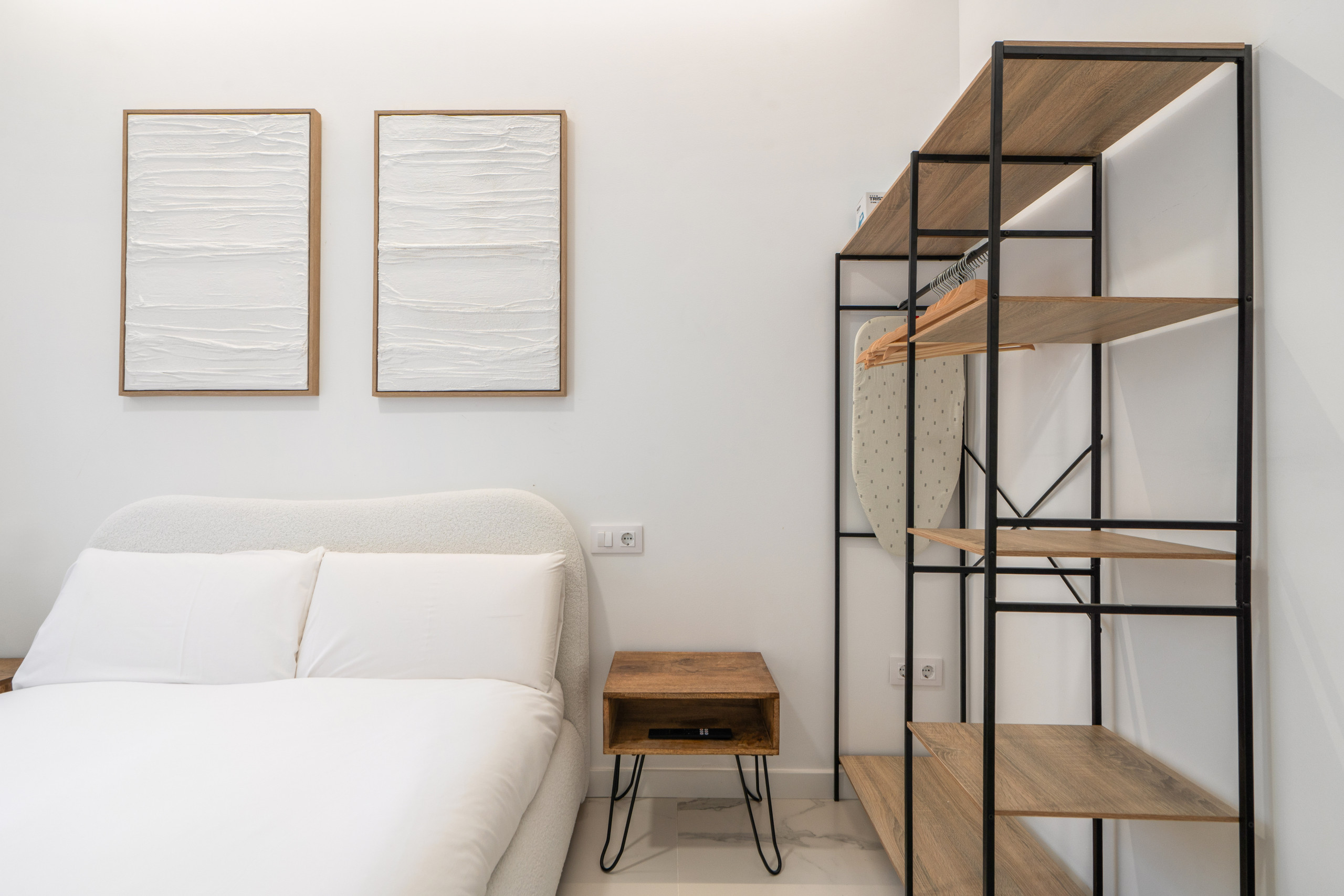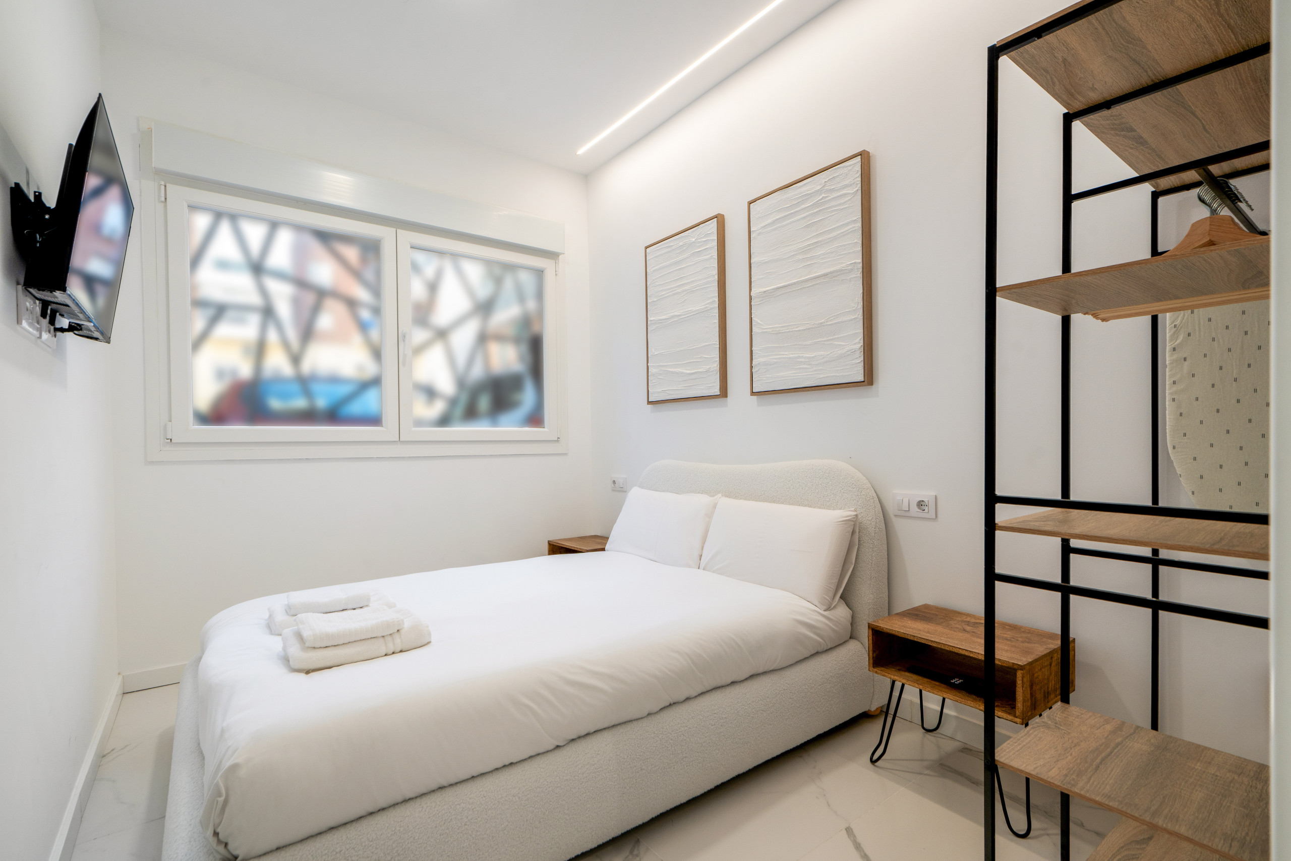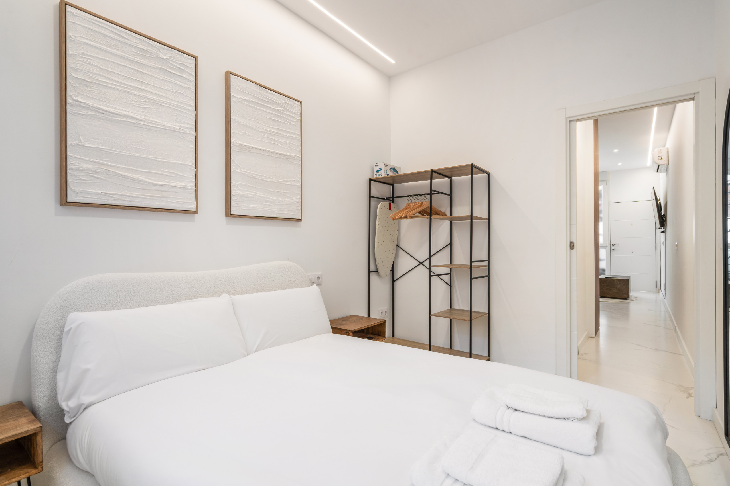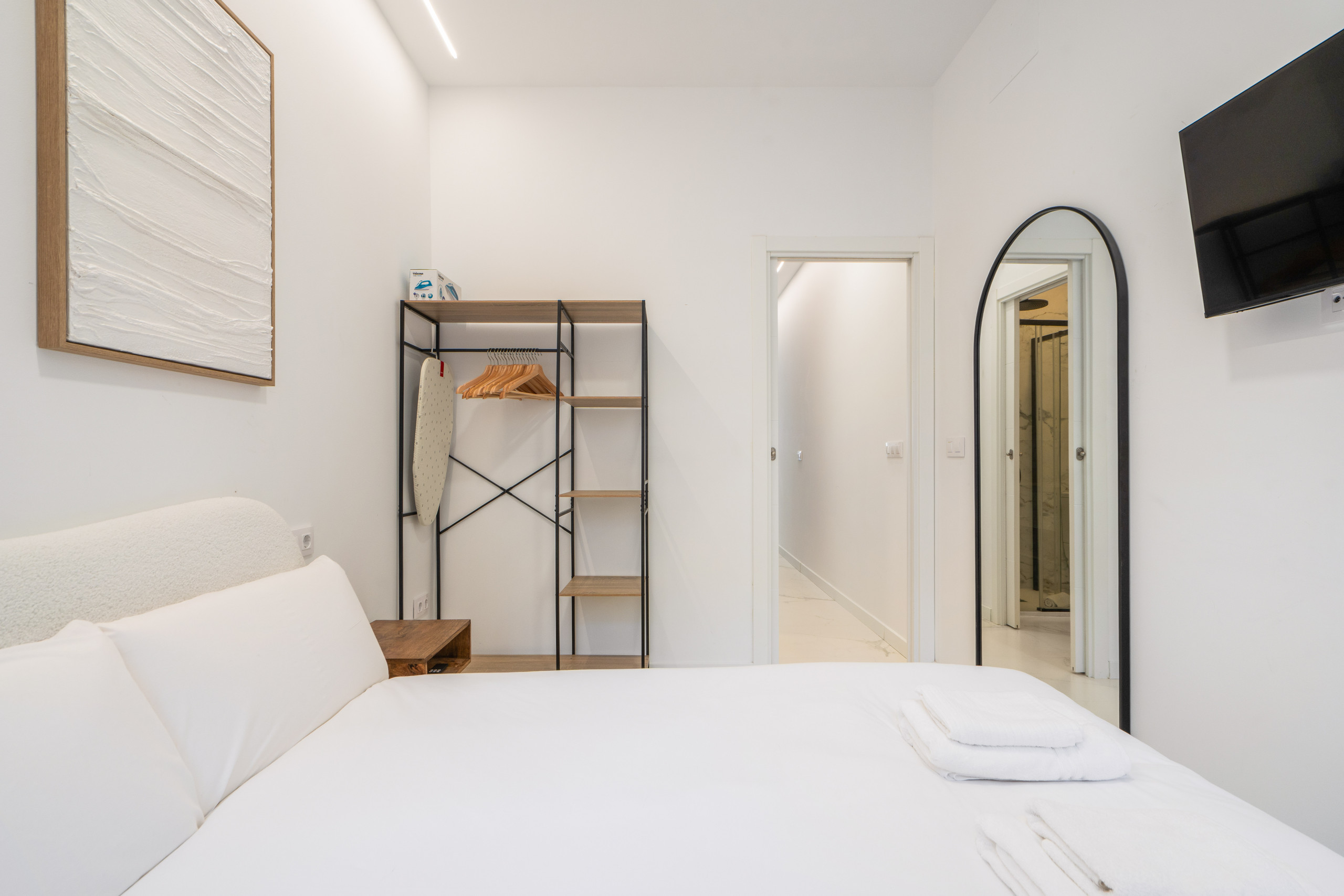 El Dormitorio: Tu descanso es sagrado. Disfruta de una cama doble con colchón de alta gama a estrenar, ropa de cama de calidad hotelera y armario empotrado con espacio suficiente para estancias largas.