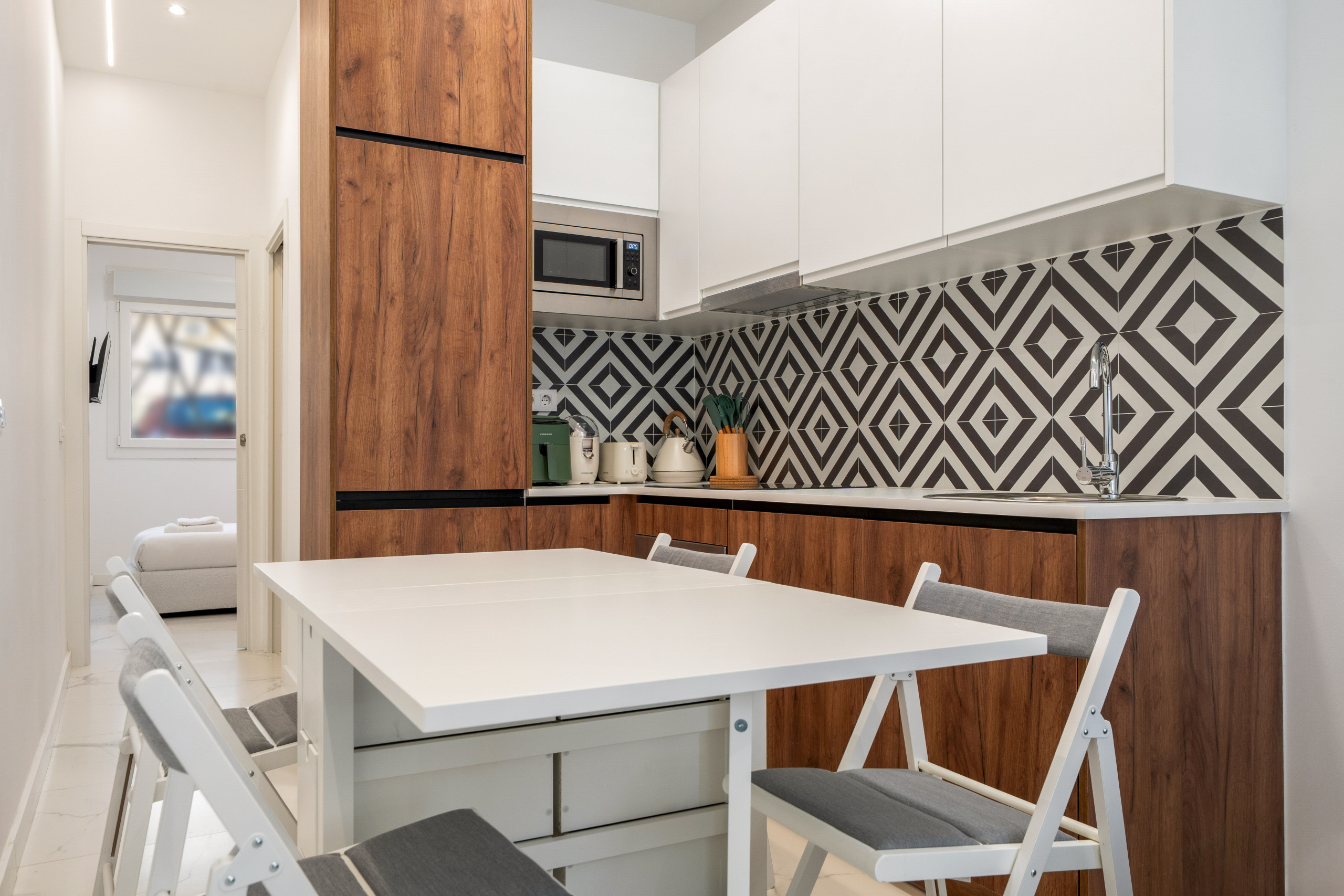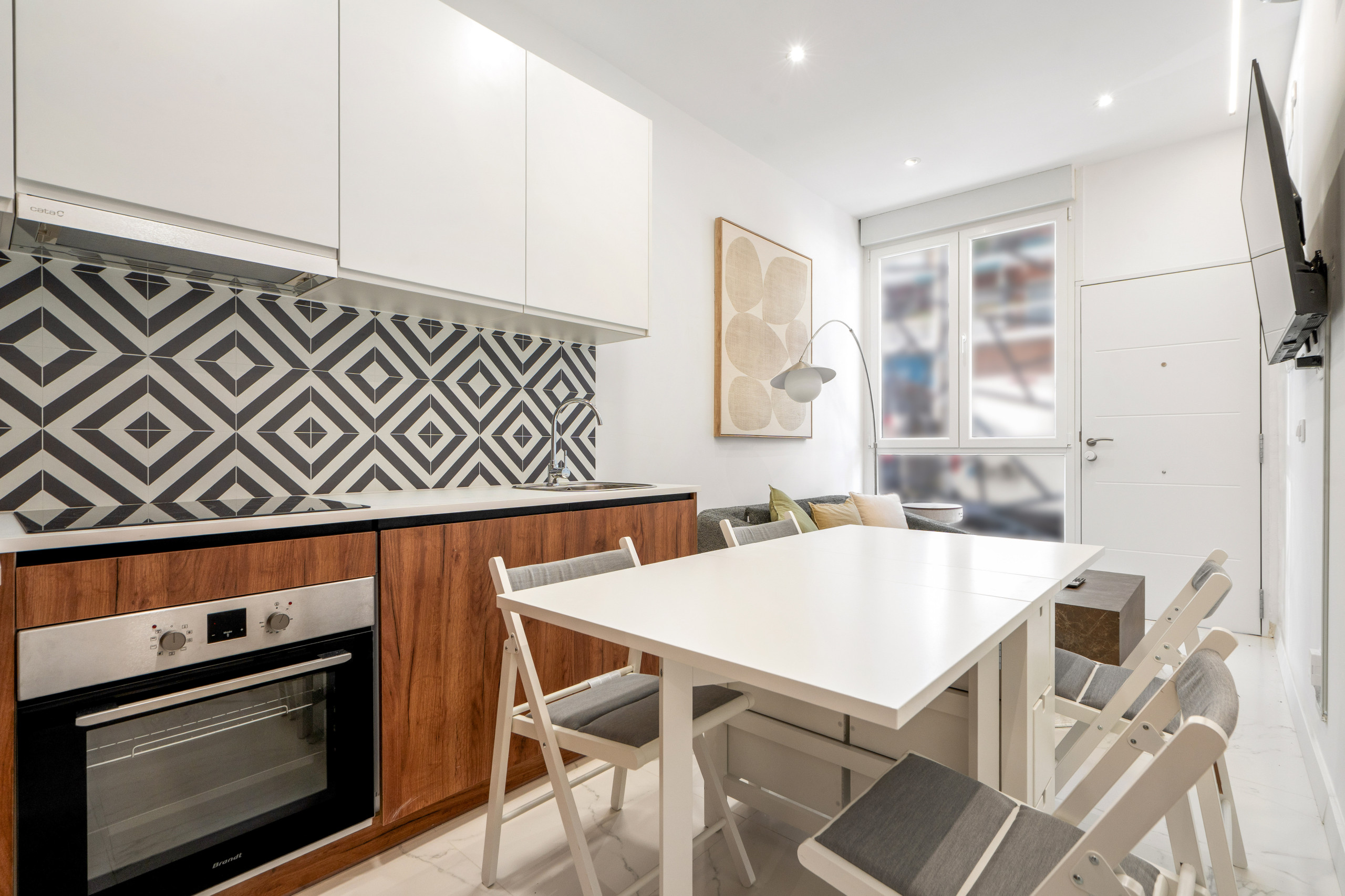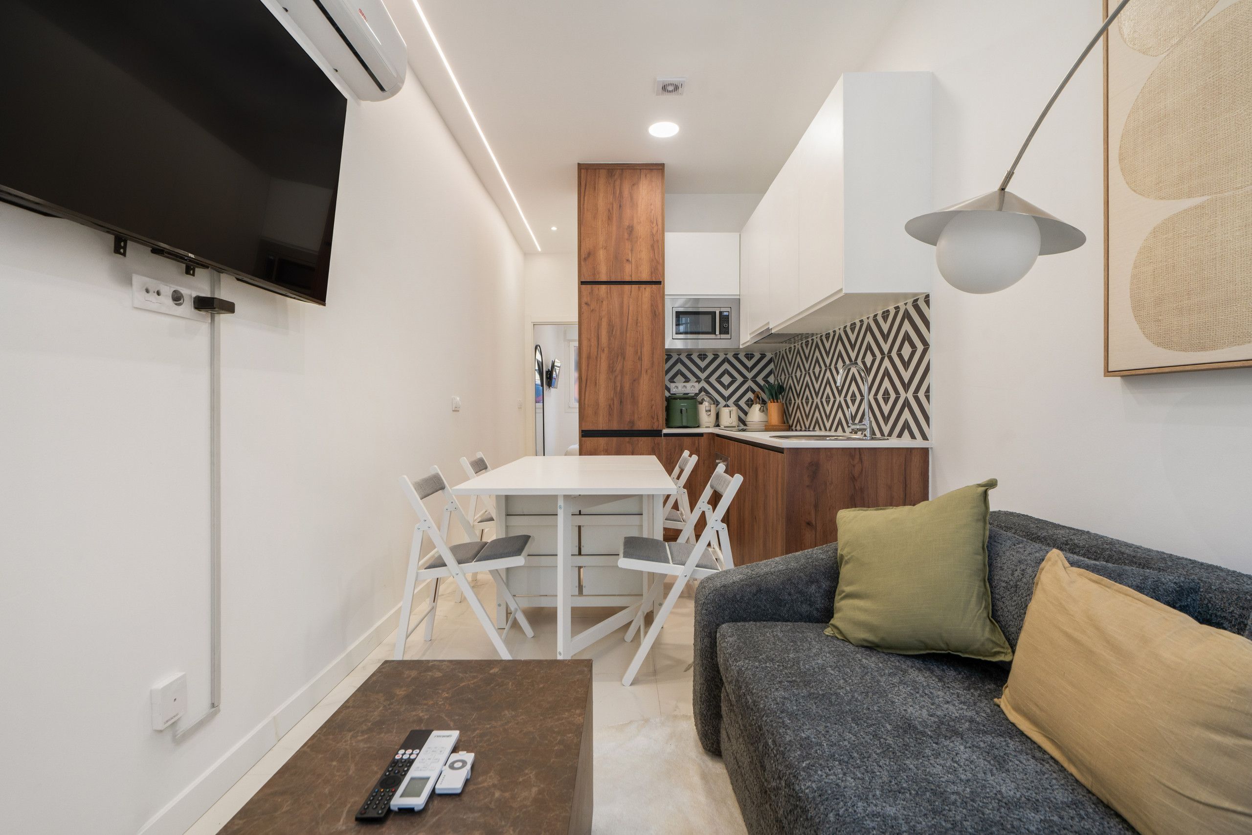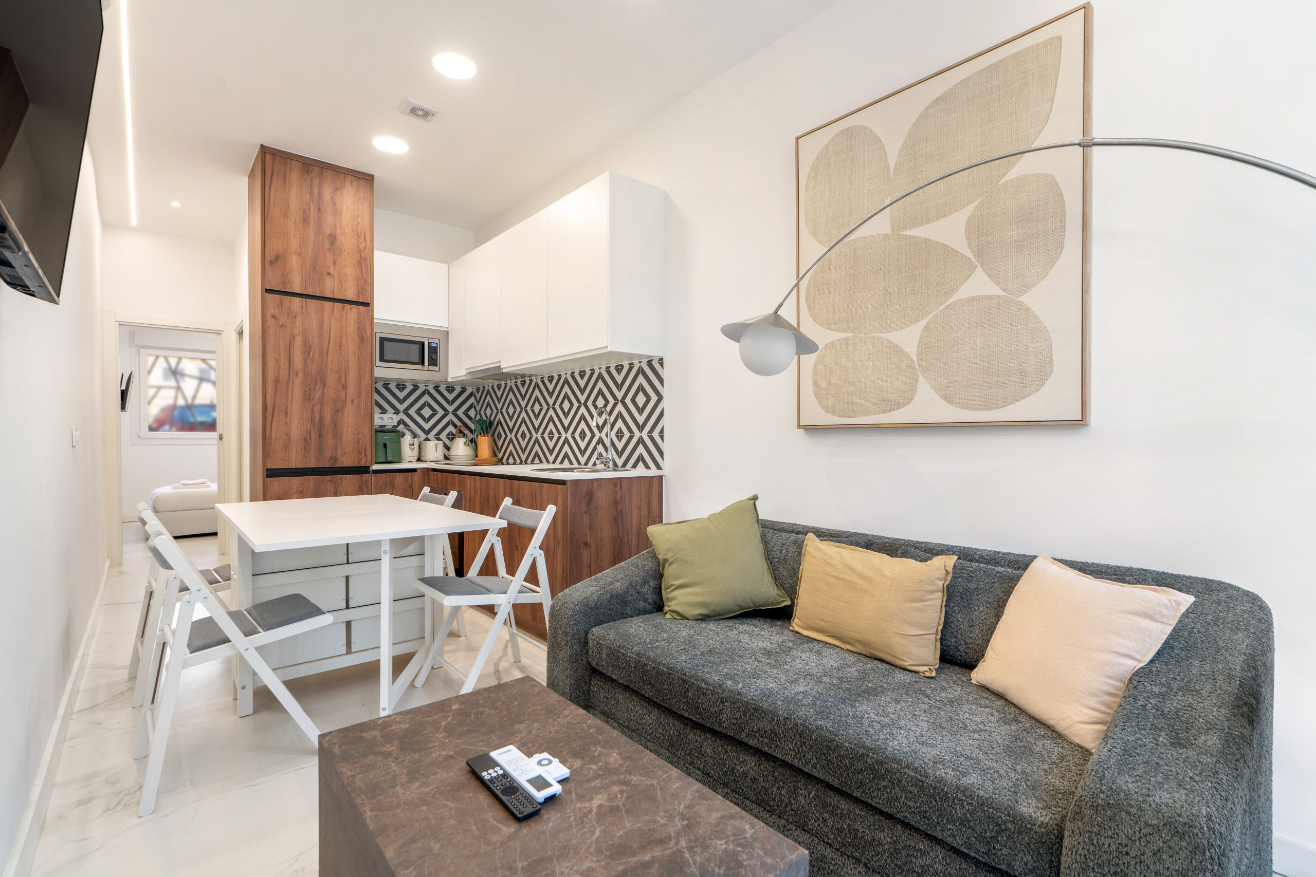 El Salón: Un espacio abierto y luminoso con decoración moderna. Cuenta con un cómodo sofá cama, Smart TV 55 con acceso a tus apps favoritas (Netflix, Prime, etc.) y una zona de comedor ideal para dos personas.